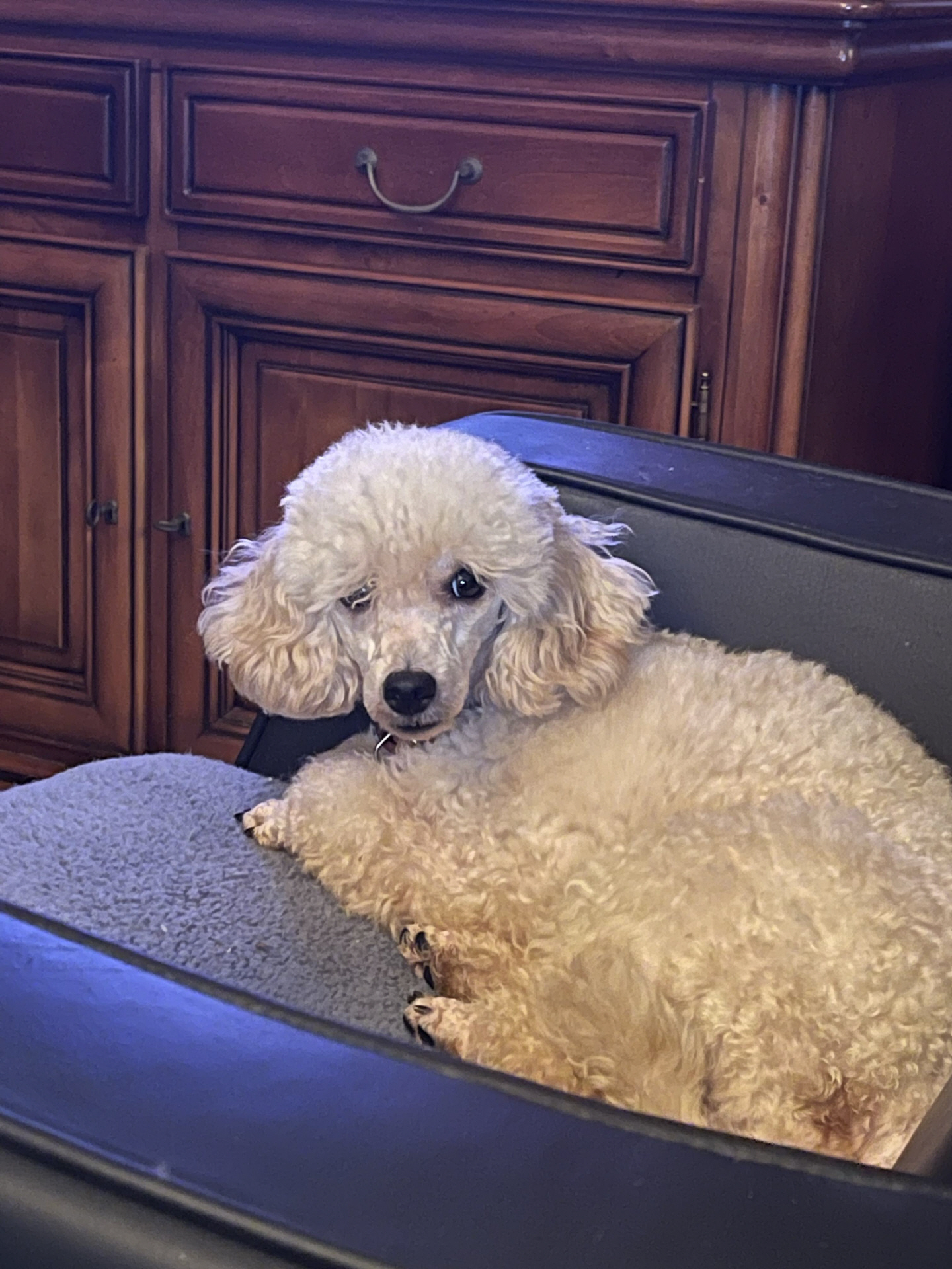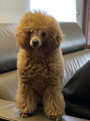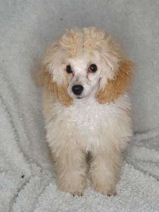 Dwerg Poedel reu, fawn (schofthoogte 30 cm). Test resultaten: * patella luxatie: vrij * pra/cataract: ECVO vrij * DNA Laboklin: DM N/N, vWD N/N, NE N/N, PRCD N/N (A), RCD4 N/N |