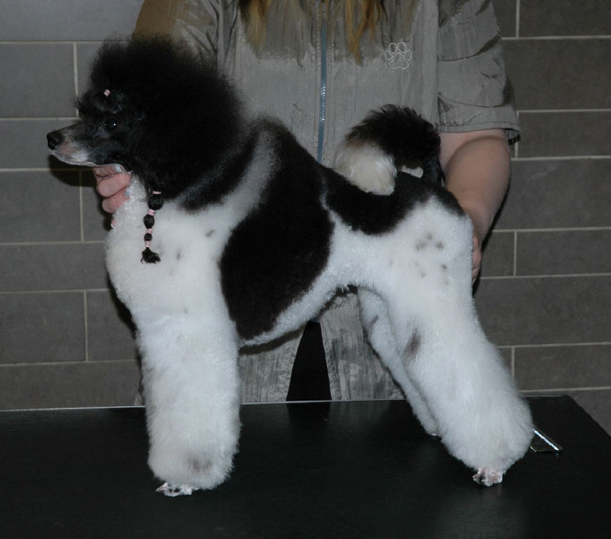 De vacht mag niet zo kort zijn dat de structuur niet meer te beoordelen is, maar een poedelshowtoilet hoeft niet. Een goed verzorgde hond is genoeg.