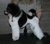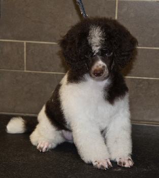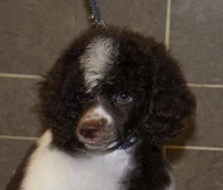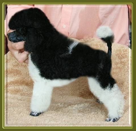 Een fout is bruine vlekken (black and tan) aftekeningen, dit zie je aan de bruine wenkbrauwen, binnenkant oor, onder de staart aanzet en wat aan de benen. Eigenlijk zijn dit black and tan poedels met witte vlekken.