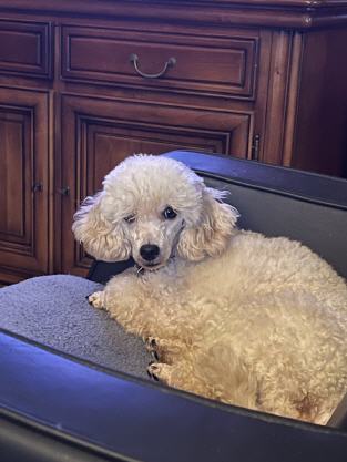 Dwerg Poedel reu, fawn (schofthoogte 30 cm). Test resultaten: * patella luxatie: vrij * pra/cataract: ECVO vrij * DNA Laboklin: DM N/N, vWD N/N, NE N/N, PRCD N/N (A), RCD4 N/N |